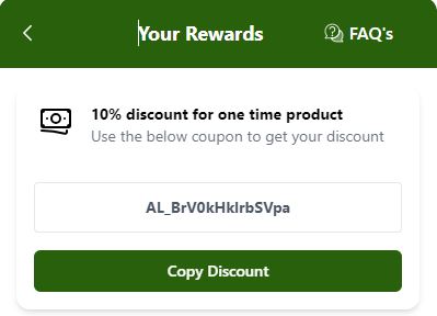 Click "Copy Discount" and paste this into the "discount" field in the checkout. Alternatively you can arrow back and select the code again at a later date. This discount will appear on your dashboard until it is used at the checkout.
