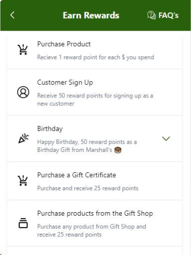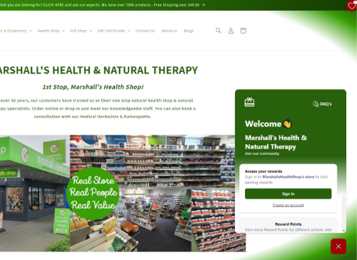 Initially your Loyalty Program will show "Welcome to Marshall's Health & Natural Therapy". Once you "Sign in" or "Create an Account", your name and reward points will appear.