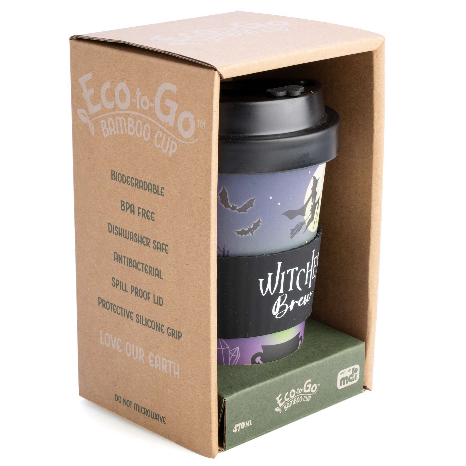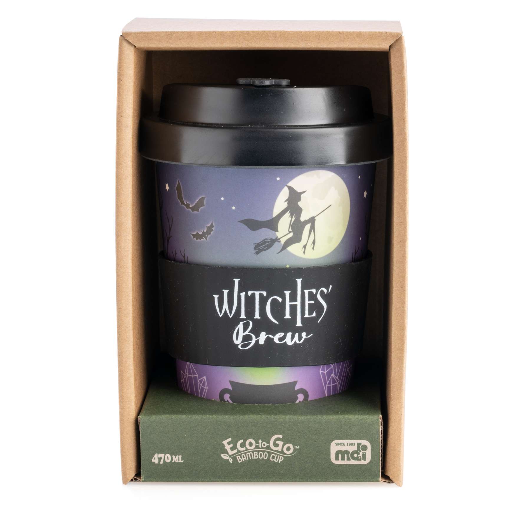- Matching black anti-spill lid and protective silicone band with ‘Witches’ Brew’ text