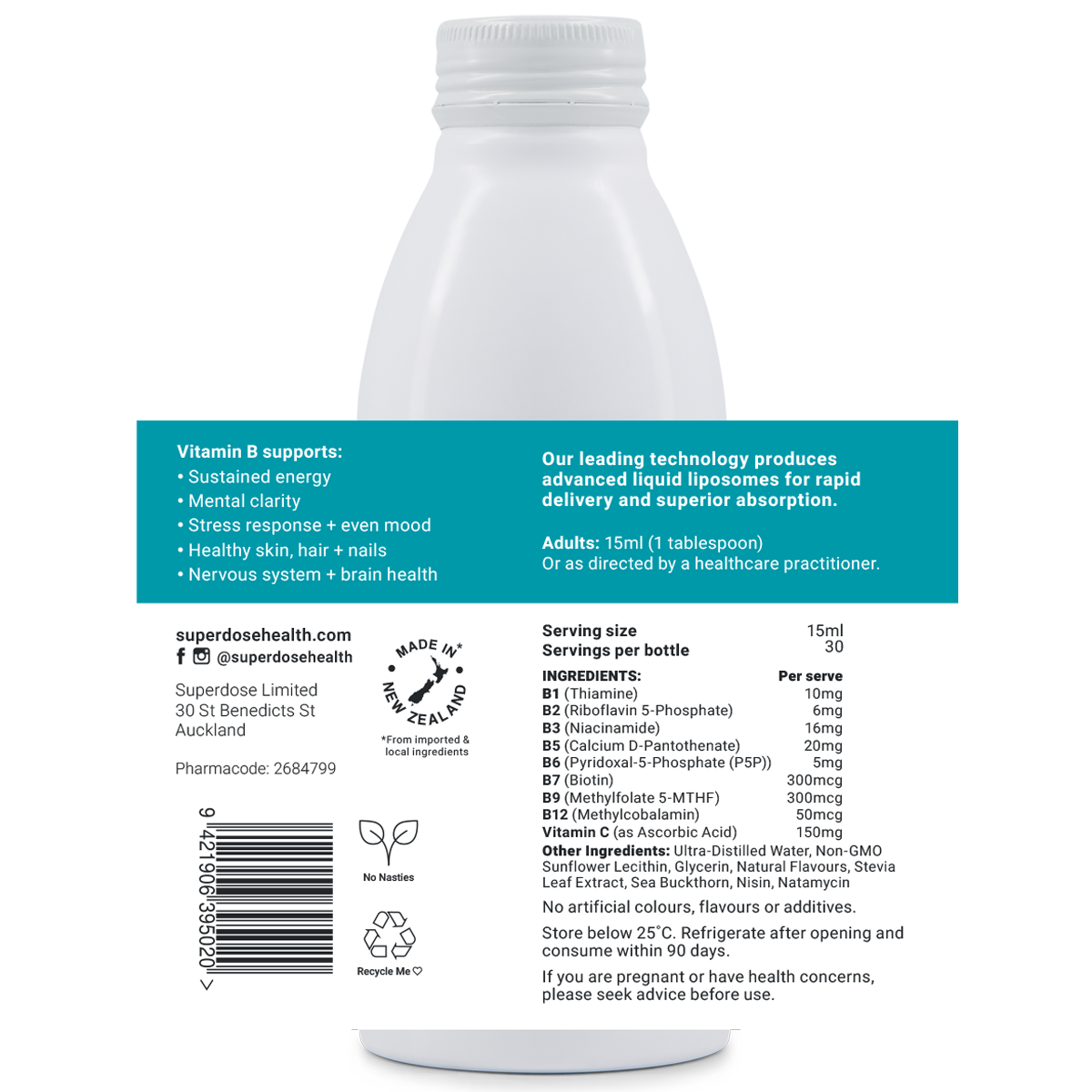 Superdose Liposomal Vitamin B Complex is a premium blend of essential B vitamins crafted to support sustained energy throughout the day and nervous system health, helping you effectively navigate the challenges of modern life. Since our bodies cannot produce B vitamins, regular replenishment is essential. Our advanced formula stands out in two key ways: Firstly, we use active, methylated forms of B vitamins that the body can readily utilise without any conversion. Secondly, our superior liposomal technology improves the delivery of these vital nutrients, ensuring superior absorption and cellular support.